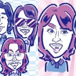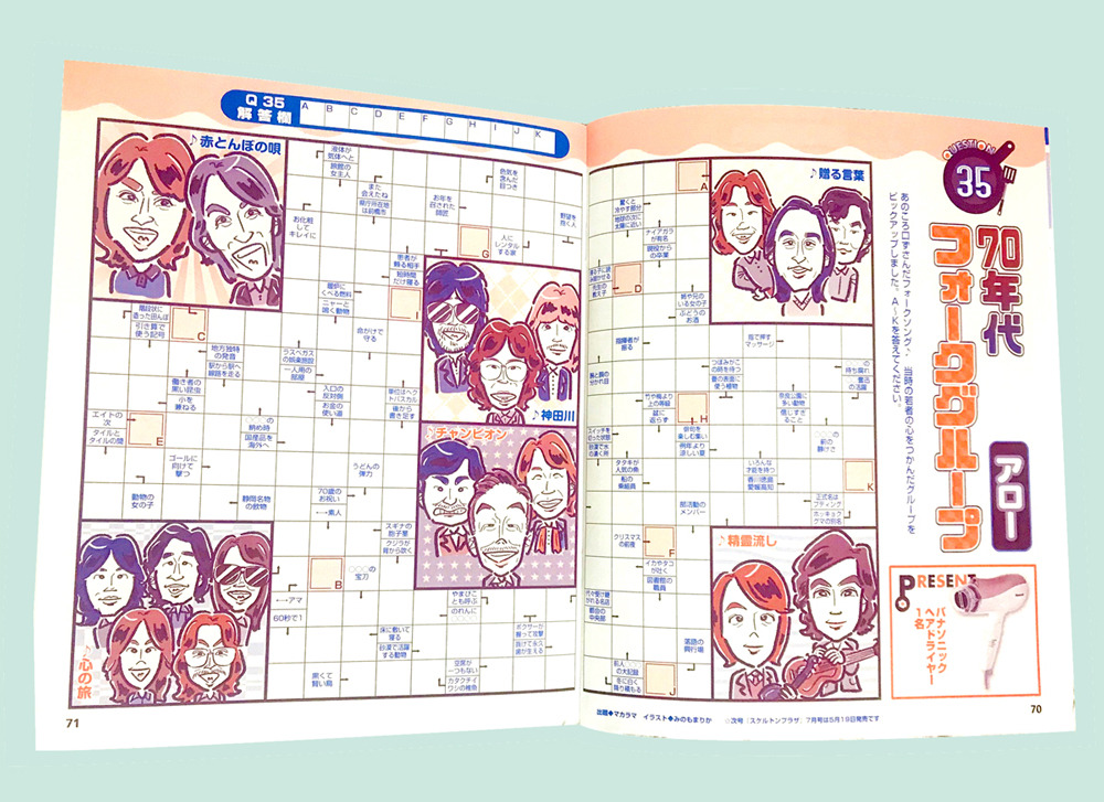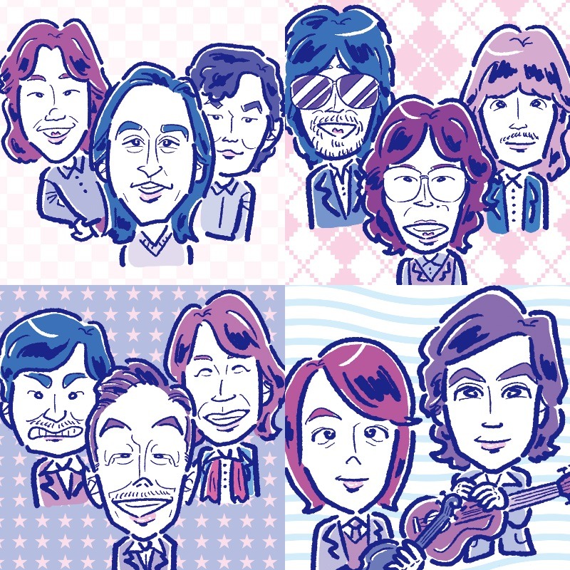 「スケルトンプラザ5月号(コスミック出版社様)」にて、70年代フォークグループのアーティストを総勢6バンドの似顔絵イラストを描きました。