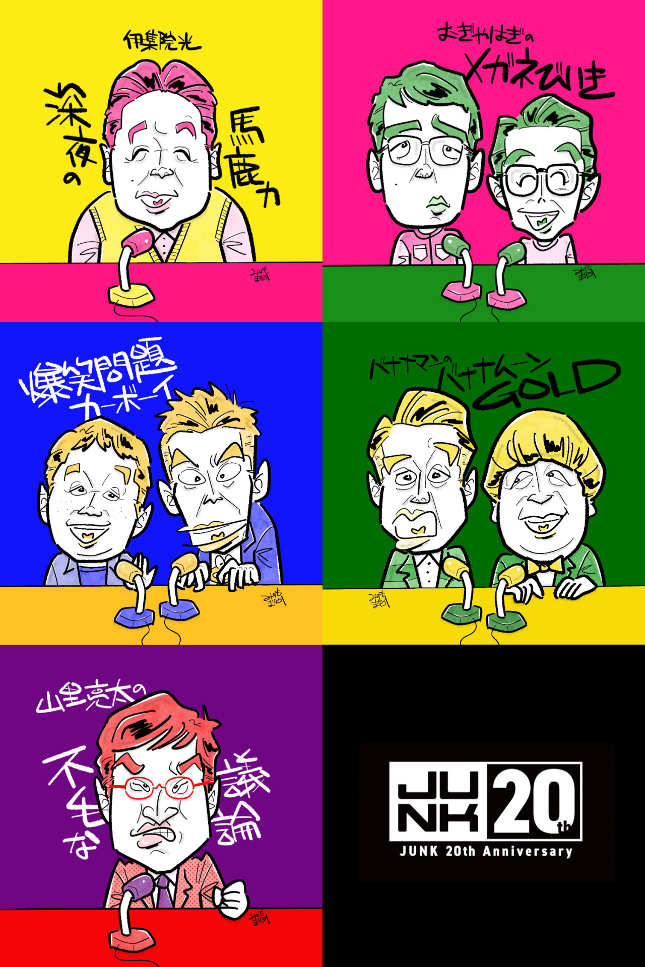 ・出演(曜日順):伊集院光、爆笑問題(太田光・田中裕二)、山里亮太、おぎやはぎ(矢作兼・小木博明)、バナナマン(設楽統・日村勇紀)敬称略▼JUNK20周年スペシャルサイト