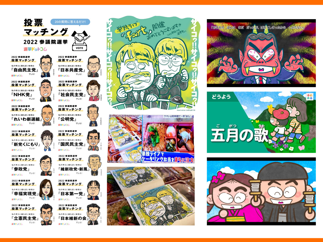 今年は個展や多くのイベント参加、選挙ドットコム様にて描きたかった議員さんイラストも描けました。空気階段さんのケータリングお弁当イラストも。